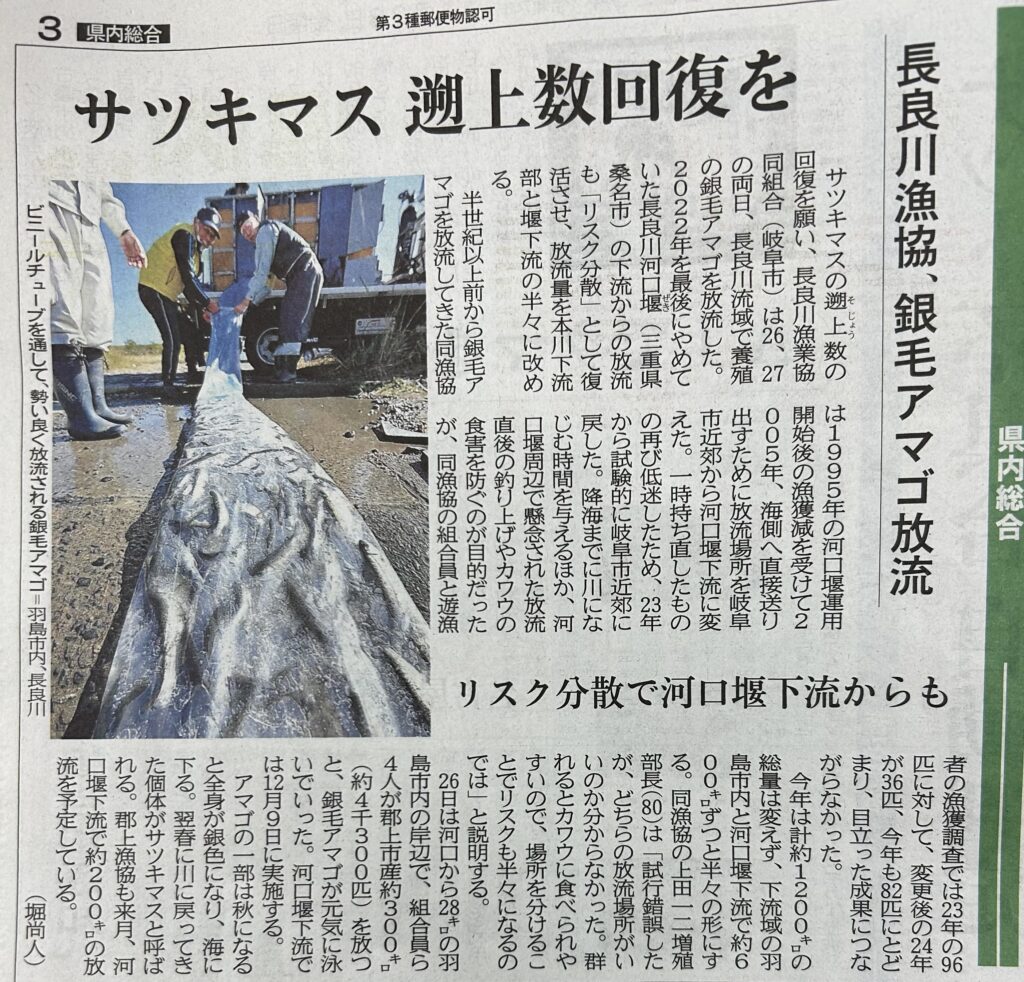 2025.11.30 県内 漁協情報 【長良川漁協ー銀毛アマゴ放流】 サツキマスの遡上数の回復を願い、11月26、27日の両日長良川流域で計1200キロの銀毛アマゴの放流が行われました。長良川河口堰の下流からの放流もカワウの食害など、リスク分散として復活させ長良川本川の下流部と半分半分で放流されました(^^)/ 岐阜新聞に掲載されましたので是非ご一読下さい。 岐阜県漁連:平塚